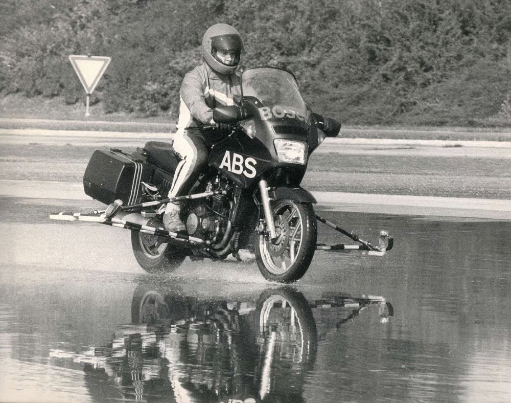 כעשר שנים לאחר הטמעת מערכות ה־ABS בכלי הרכב היוקרתיים של ב.מ.וו, הופיעה המערכת לראשונה בדו־גלגלי. ב.מ.וו הייתה החלוצה כשלקחה את המערכת מהמכוניות שלה, ביצעה לה התאמות כאלה ואחרות, והתקינה אותה באופנוע. בשנת 1988 החל להימכר ה־K 100 עם אופציה ל־ABS, וזהו האופנוע הראשון שזוכה למערכת. המערכת הראשונה של חברת בוש על האופנוע שקלה למעלה מ־11 ק"ג (!), כיום המערכת שוקלת פחות מק"ג אחד. בב.מ.וו הפנימו כי כלי דו־גלגלי אשר נועל גלגל אחורי תחת בלימה יכול בקלות להישאר על הגלגלים עד לעצירה מלאה, אפילו אם באוכף יושב רוכב ממוצע ומטה. לעומת זאת, נעילה של גלגל קדמי באופנוע תסתיים מיד בנפילה. אופנוע לא מסוגל להתקדם עם גלגל קדמי נעול יותר משבריר שנייה – בטח לא עם הג'מוסים הגדולים בדמותם של אופנועי תיור. ה־ABS מונע את החלקת שני הגלגלים, ובכך מונע גם את הנפילה.