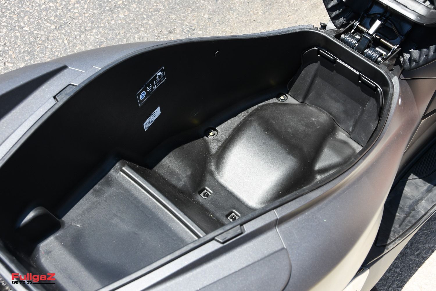 תא המטען גדל מעט ל-28 ליטרים ומכיל קסדה מלאה, אך צריך 'להנדס' אותה לזווית הנכונה, ויש עוד מעט מקום לידה. יש גם תא עמוק מצידו השמאלי של הכידון המכיל שקע 12V. תא המטען ומכסה הדלק נפתחים ממתגים שממוקמים מתחת למתג ההנעה וניתנים לפתיחה רק כשהאופנוע כבוי אך לא נעול – מעט מבלבל לפעמים אך מתרגלים.