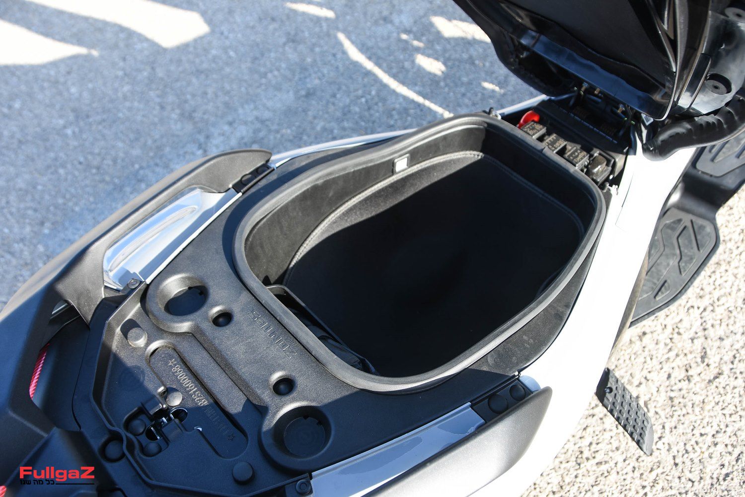 הזונטס 250M מגיע עם צמד מפתחות קרבה קטנים, ורצועה ייעודית. אפשר להלביש את הרצועה על מפתח הקרבה ולענוד אותו על הזרוע כמו שעון, או צמיד כושר – פטנט יעיל ופשוט. ללא מפתח פיזי כמובן שפתיחת תא המטען ומכסה התדלוק מתבצעת בעזרת מתגים, בצידו הימני של הכידון. תא המטען מתחת למושב מרובע ועמוק אך לא הצלחנו לאחסן בו קסדה מלאה. בחזית הקטנוע צמד תאי כפפות, אך הכפפות היחידות שייכנסו בו הן כפפות חד־פעמיות. שני התאים קטנים, ויכילו אולי רישיונות או צרור מפתחות קטן. בתא השמאלי נמצא גם מטען USB כפול: אחד רגיל ואחד Type-C. עוד בצידו הימני של הכידון נמצא מתג לבחירה בין תאורת יום המאירה באור בוהק אך מסנוור, לאורות דרך סטנדרטיים.