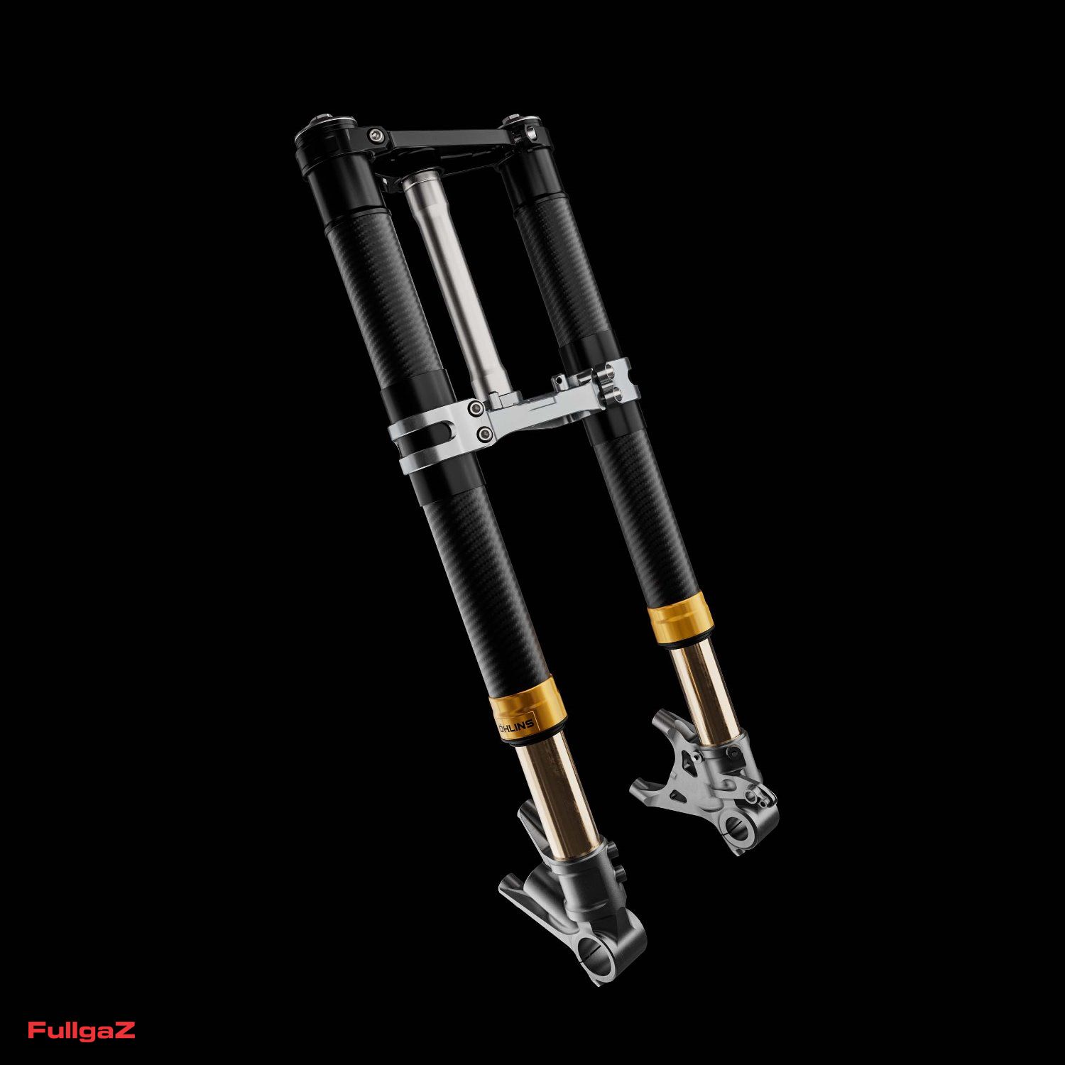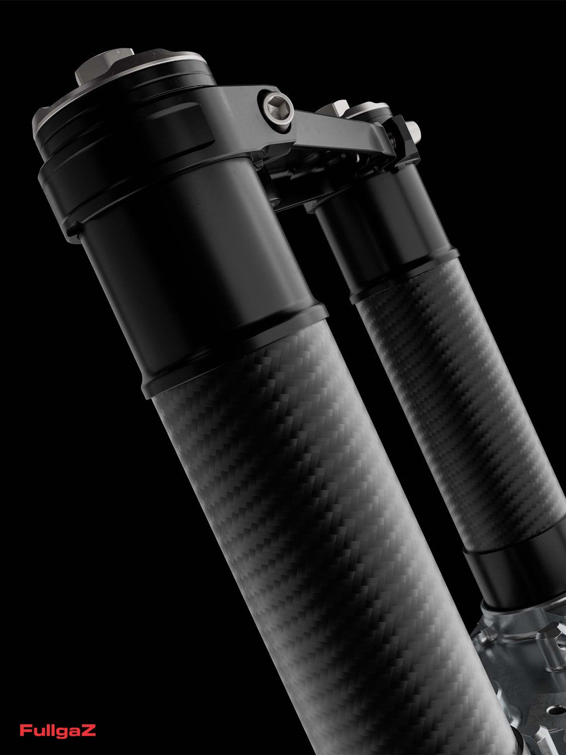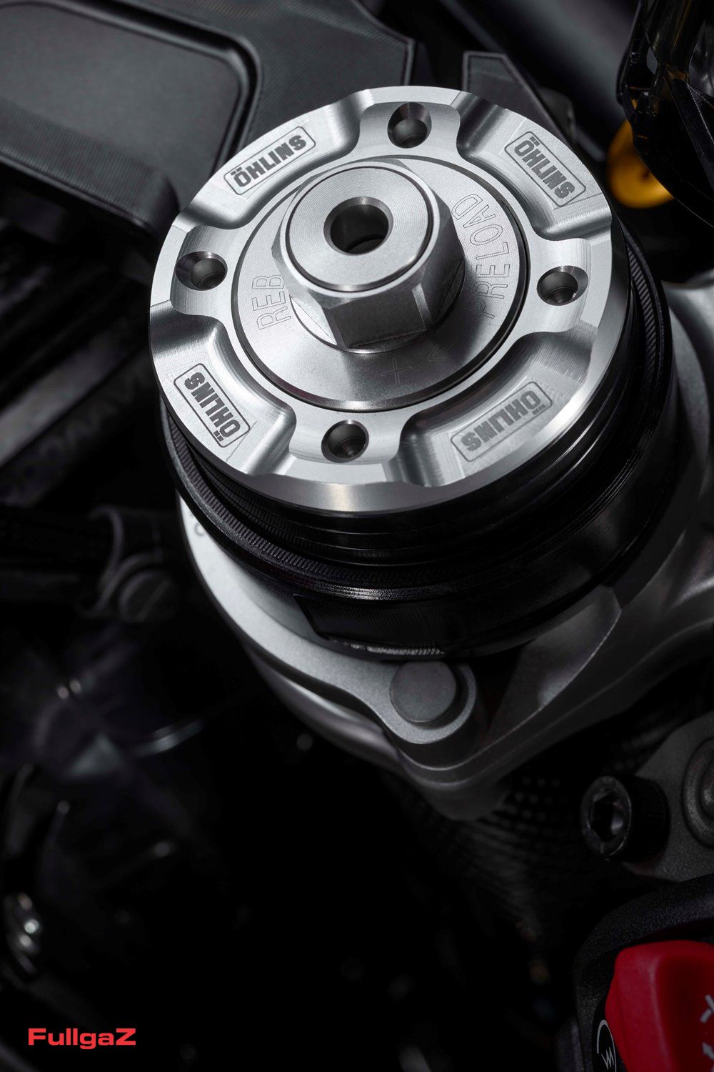 הבולמים של אוהלינס הם מהטופ שיש לתעשייה להציע, והם כוללים זרועות מזלג בקוטר 43 מ"מ מקרבון, שסתומים שלקוחים מאופנועי ה־GP של דוקאטי, מיכלי גז בלחץ לטלסקופים, וחלקים קלים – כמו קפיץ אחורי מטיטניום או תחתיות בולמים קדמיים מכורסמים מאלומיניום. הכיוונון הוא ידני, כנהוג באופנועי מסלול, ולא אלקטרוני.