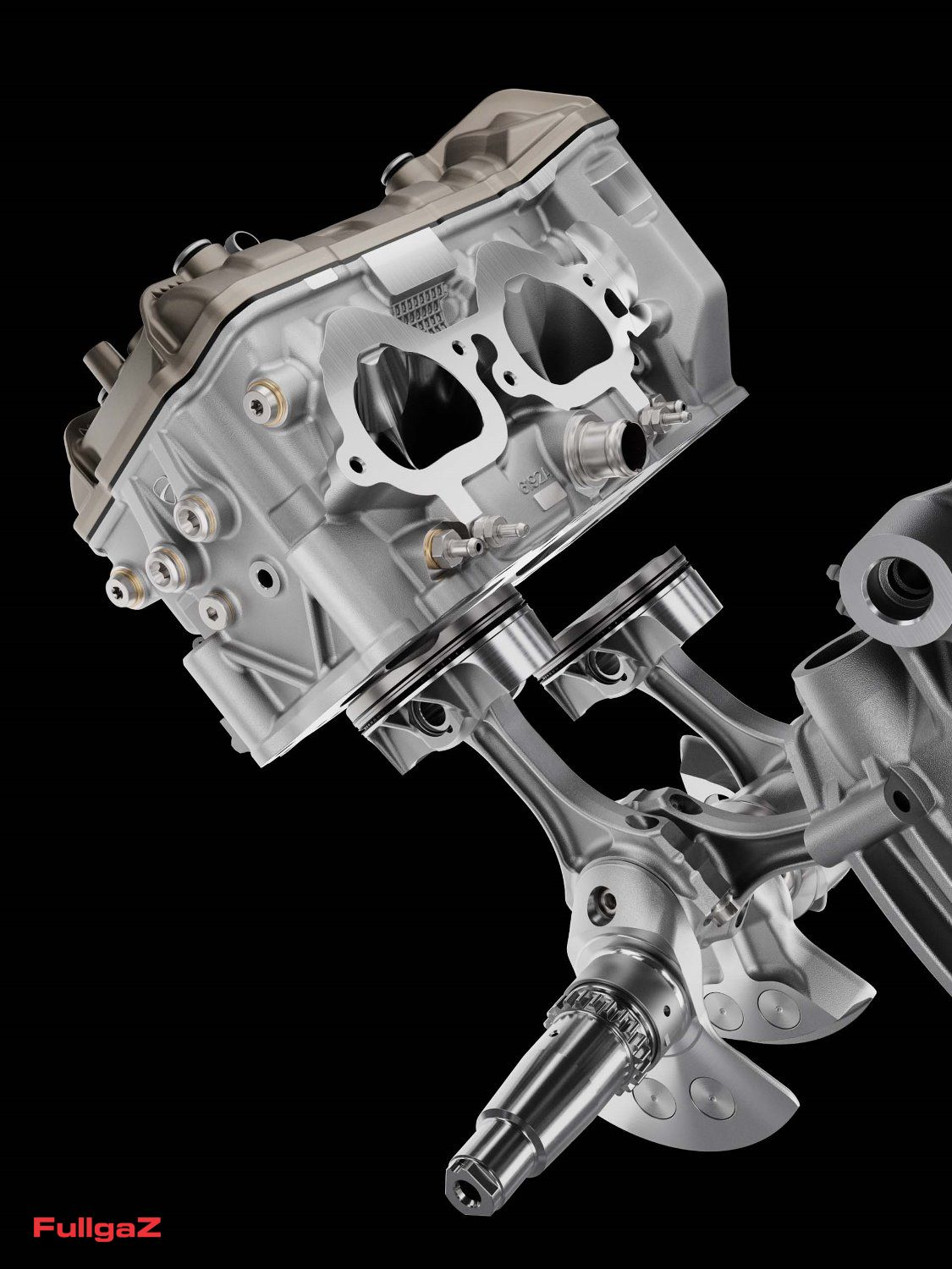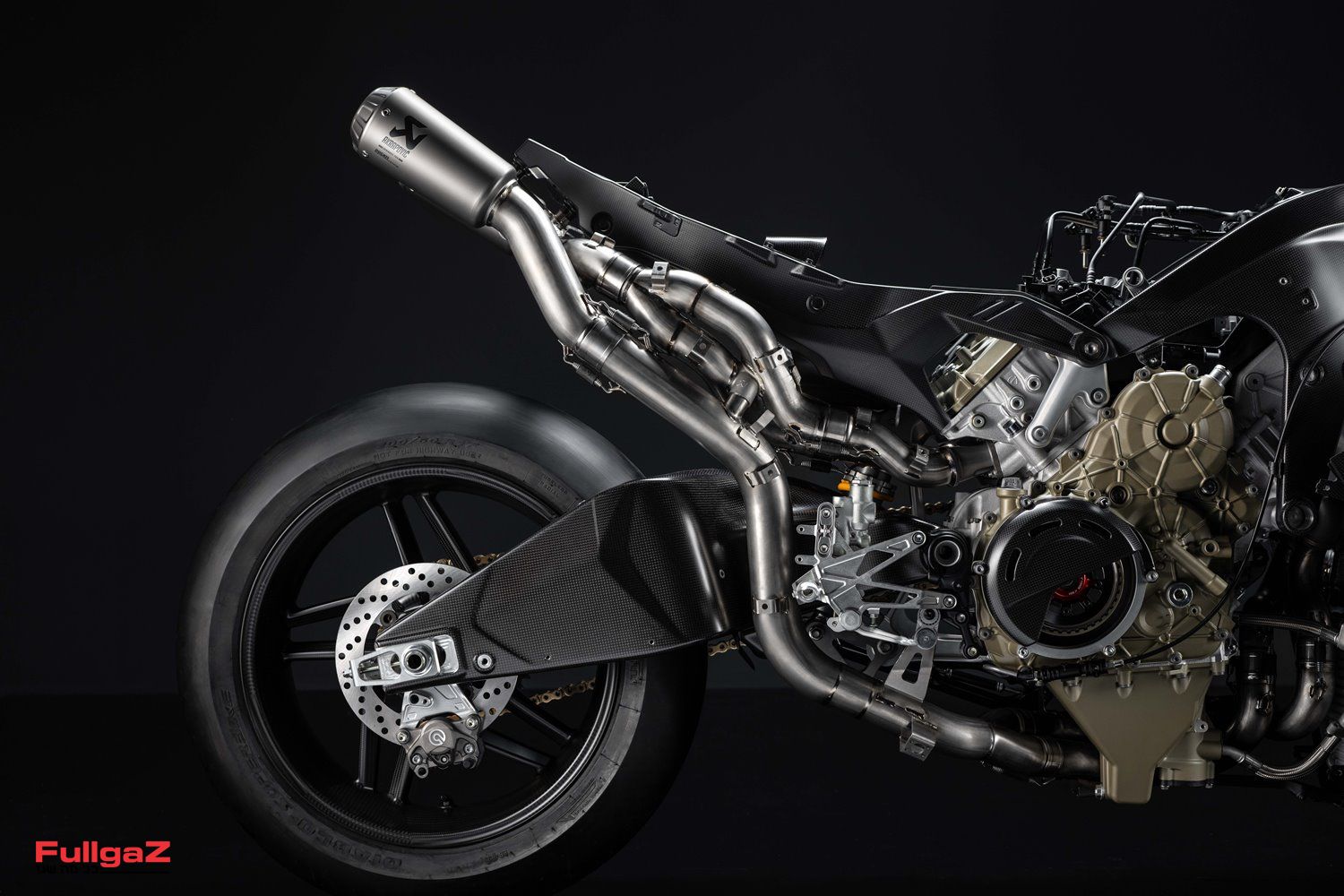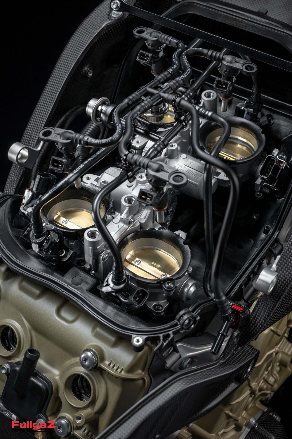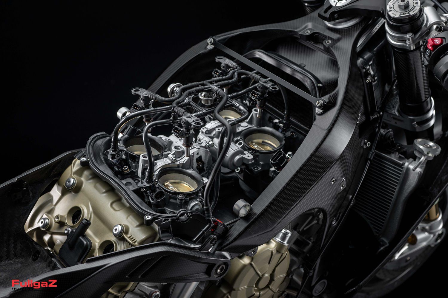 גם המנוע החדש תורם את חלקו להורדת המשקל. מנוע הדזמוסדיצ'י סטרדלה R עולה כאן מ־998 סמ"ק ל־1,103 סמ"ק בזכות הגדלת מהלך הבוכנה ושימוש במכלולים פנימיים קלים וחזקים יותר. ההספק עומד על 228 כ"ס, שהם זהים לפניגאלה V4 R, אבל המנוע החדש מאפשר תגובת מצערת מהירה יותר ועלייה לסל"ד גבוה יותר. קיט המרוצים שהוזכר מקודם מאפשר 247 כ"ס ומביא את האופנוע ליחס של 1.48 כ"ס לכל ק"ג. המנוע החדש קל ב־3.6 ק"ג מהפניגאלה 'הרגיל'. תיבת ההילוכים אגב, ממקמת את הניוטרל בתחתית וניתן להגיע אליו רק באמצעות לחיצה על ידית בכידון.