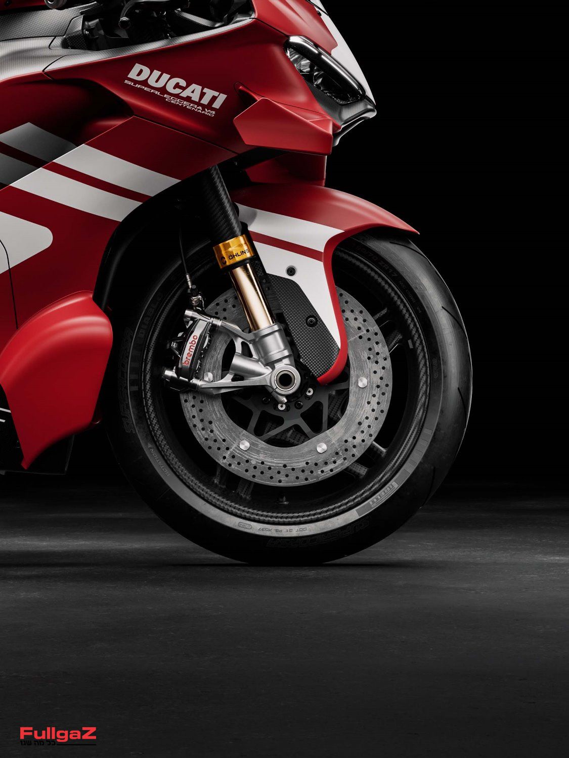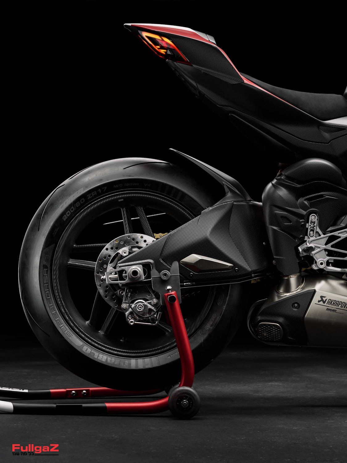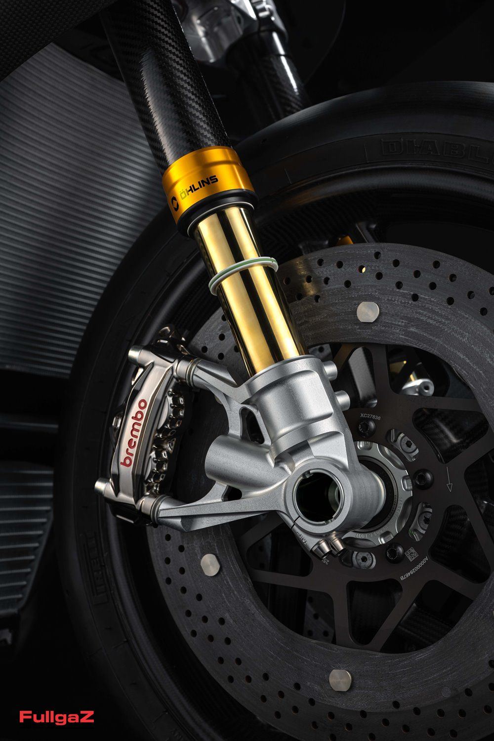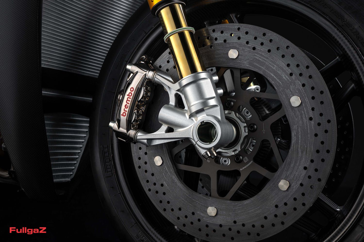 בדוקאטי מציינים השנה 100 שנים לחברה בצורה הכי ברורה שאפשר, עם אופנוע־על שלוקח את כל מה שאפשר לחשוב עליו בתחום הדו־גלגלי ומביא אותו היישר אל הסוכנות בתל־אביב עם לוחית רישוי צהובה, מאותתים ומראות. אם הסופרלג'רה (סופר־קל באיטלקית) V4 הקודם היה האופנוע החזק ביותר והטכנולוגי ביותר שיצא ממפעלי דוקאטי שבבורגו פניגאלה (רובע פניגאלה שבבולוניה), אז זה החדש מאפיל עליו. מוטיב השימוש בקרבון שכולל שלדה, זרוע אחורית כפולה מקרבון וחישוקי BST מהחומר האקזוטי וקל המשקל ממשיך כאן, כשלראשונה באופנוע עם רישוי כביש יש גם שימוש במערכת בלמים של ברמבו שכוללת קליפרים מסוג GP4 HY ודיסקים בקוטר 340 מ"מ מקרבון. כן, ממש כמו באופנועי מרוץ.