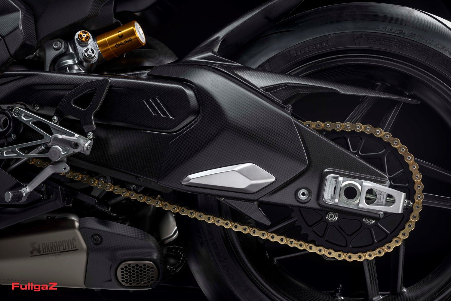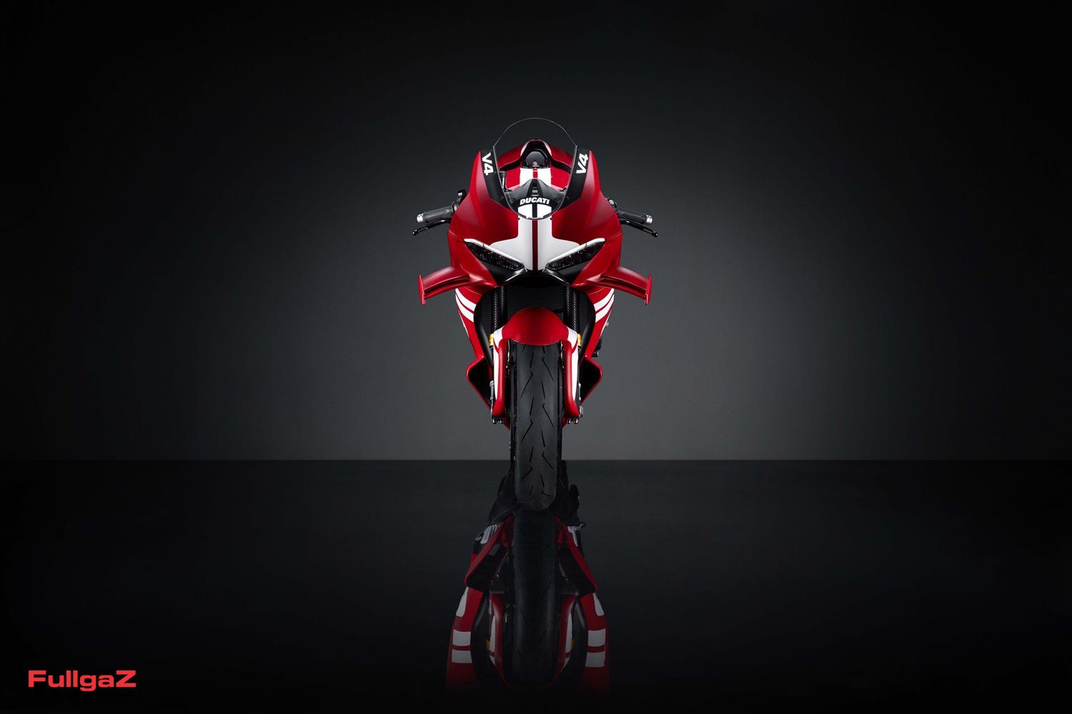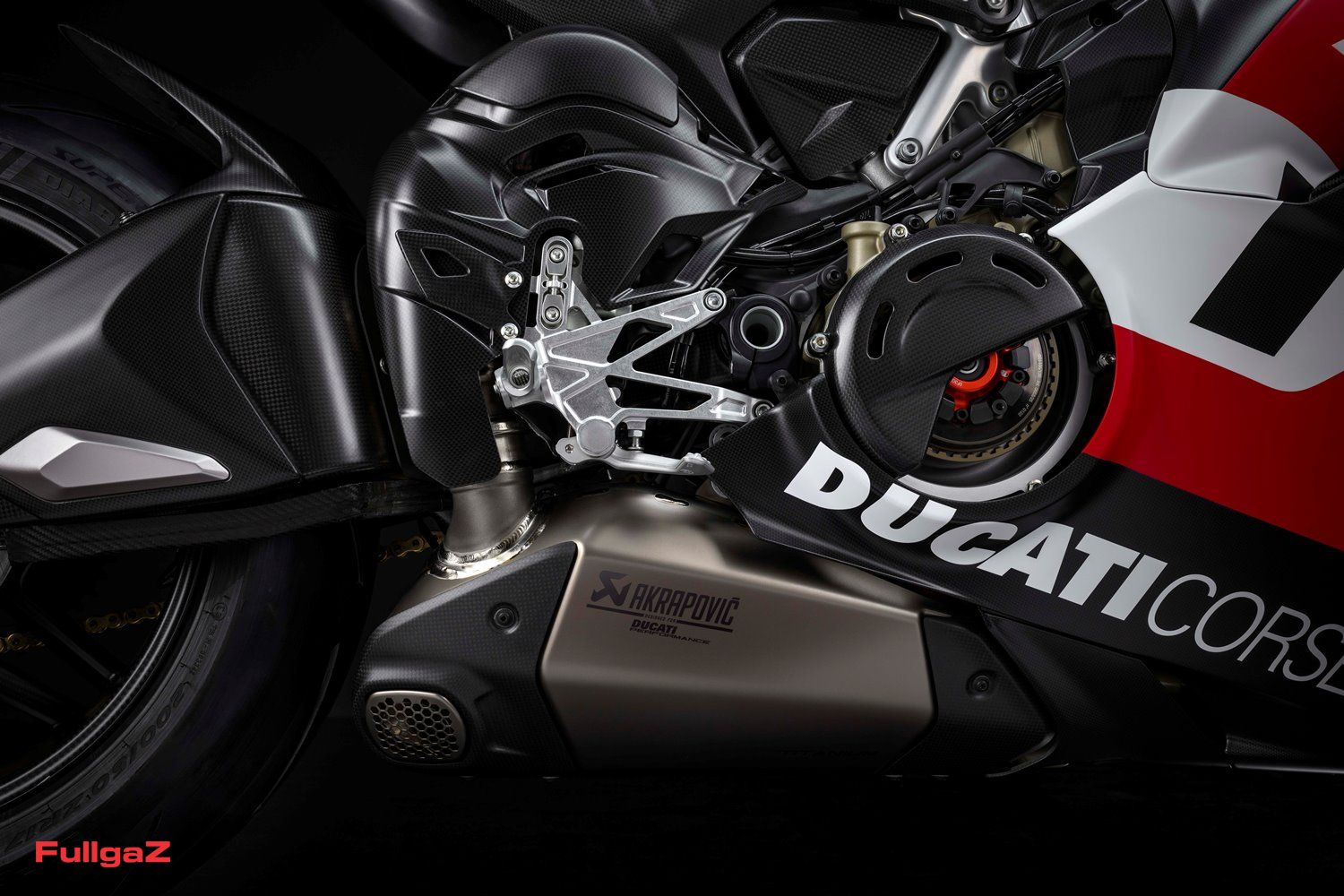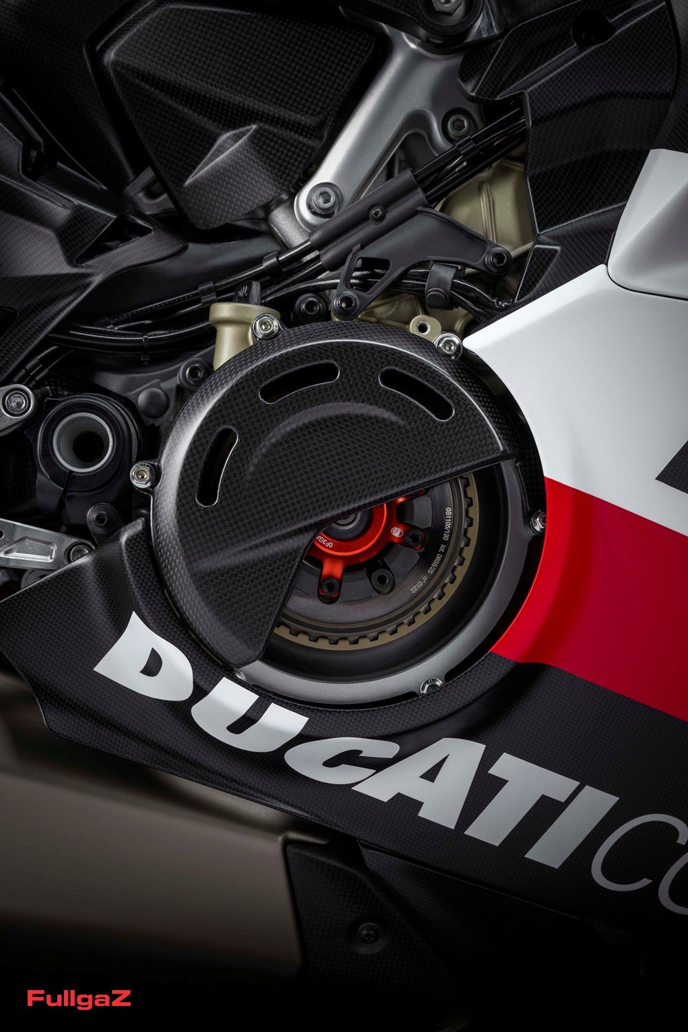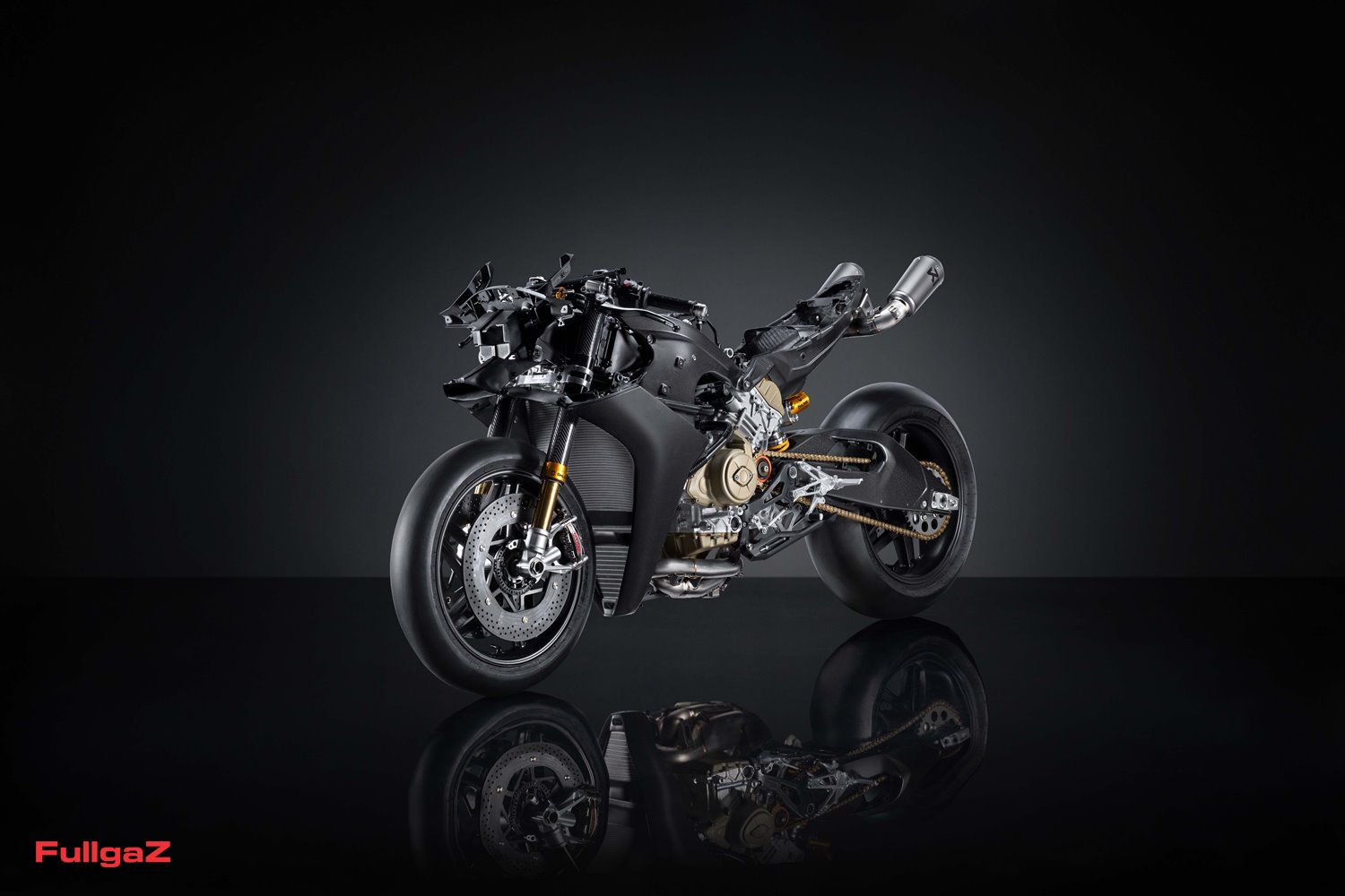 בדוקאטי מציינים השנה 100 שנים לחברה בצורה הכי ברורה שאפשר, עם אופנוע־על שלוקח את כל מה שאפשר לחשוב עליו בתחום הדו־גלגלי ומביא אותו היישר אל הסוכנות בתל־אביב עם לוחית רישוי צהובה, מאותתים ומראות. אם הסופרלג'רה (סופר־קל באיטלקית) V4 הקודם היה האופנוע החזק ביותר והטכנולוגי ביותר שיצא ממפעלי דוקאטי שבבורגו פניגאלה (רובע פניגאלה שבבולוניה), אז זה החדש מאפיל עליו. מוטיב השימוש בקרבון שכולל שלדה, זרוע אחורית כפולה מקרבון וחישוקי BST מהחומר האקזוטי וקל המשקל ממשיך כאן, כשלראשונה באופנוע עם רישוי כביש יש גם שימוש במערכת בלמים של ברמבו שכוללת קליפרים מסוג GP4 HY ודיסקים בקוטר 340 מ"מ מקרבון. כן, ממש כמו באופנועי מרוץ.