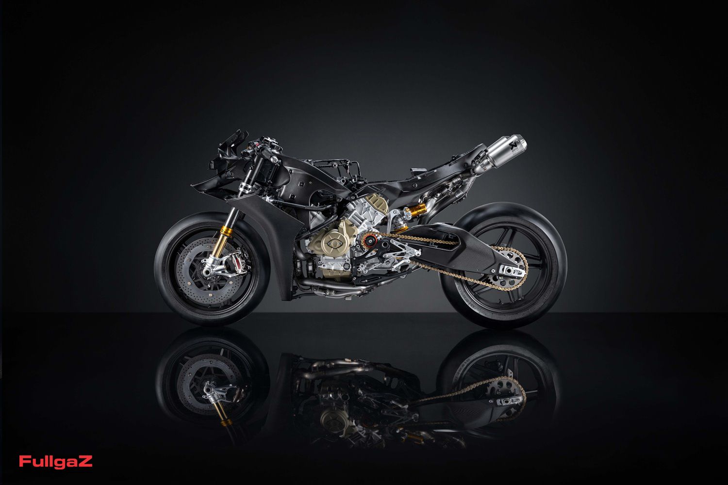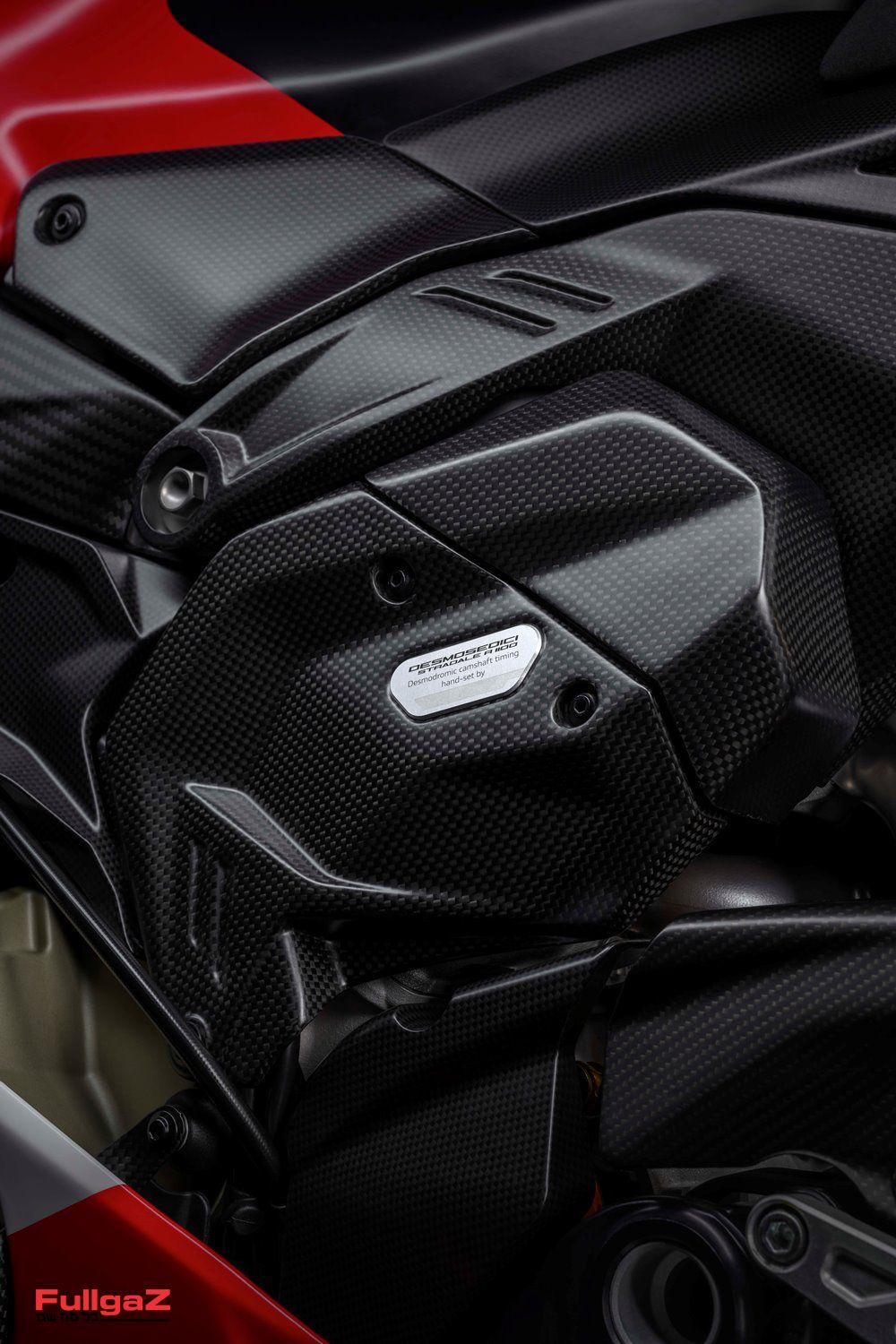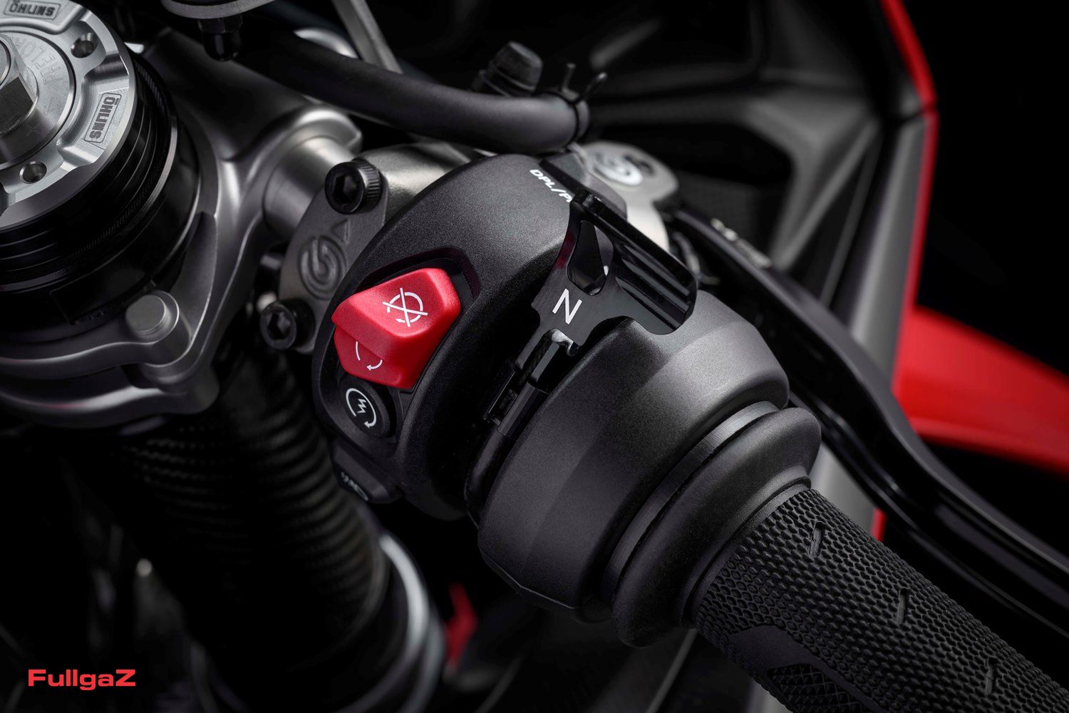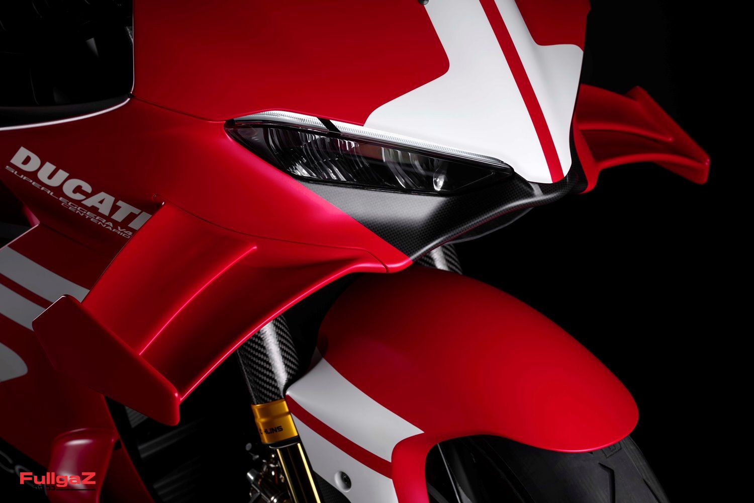בדוקאטי מציינים השנה 100 שנים לחברה בצורה הכי ברורה שאפשר, עם אופנוע־על שלוקח את כל מה שאפשר לחשוב עליו בתחום הדו־גלגלי ומביא אותו היישר אל הסוכנות בתל־אביב עם לוחית רישוי צהובה, מאותתים ומראות. אם הסופרלג'רה (סופר־קל באיטלקית) V4 הקודם היה האופנוע החזק ביותר והטכנולוגי ביותר שיצא ממפעלי דוקאטי שבבורגו פניגאלה (רובע פניגאלה שבבולוניה), אז זה החדש מאפיל עליו. מוטיב השימוש בקרבון שכולל שלדה, זרוע אחורית כפולה מקרבון וחישוקי BST מהחומר האקזוטי וקל המשקל ממשיך כאן, כשלראשונה באופנוע עם רישוי כביש יש גם שימוש במערכת בלמים של ברמבו שכוללת קליפרים מסוג GP4 HY ודיסקים בקוטר 340 מ"מ מקרבון. כן, ממש כמו באופנועי מרוץ.