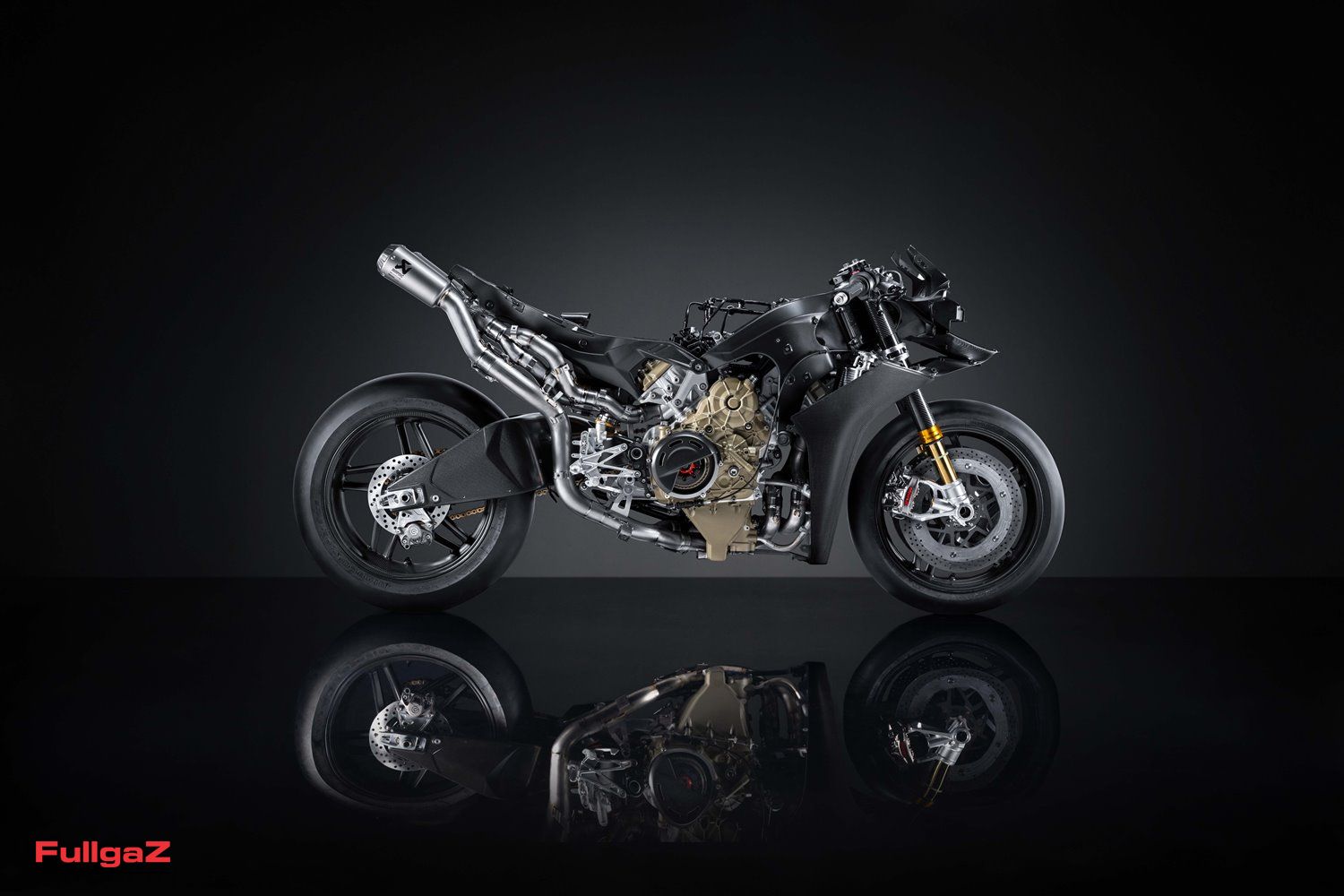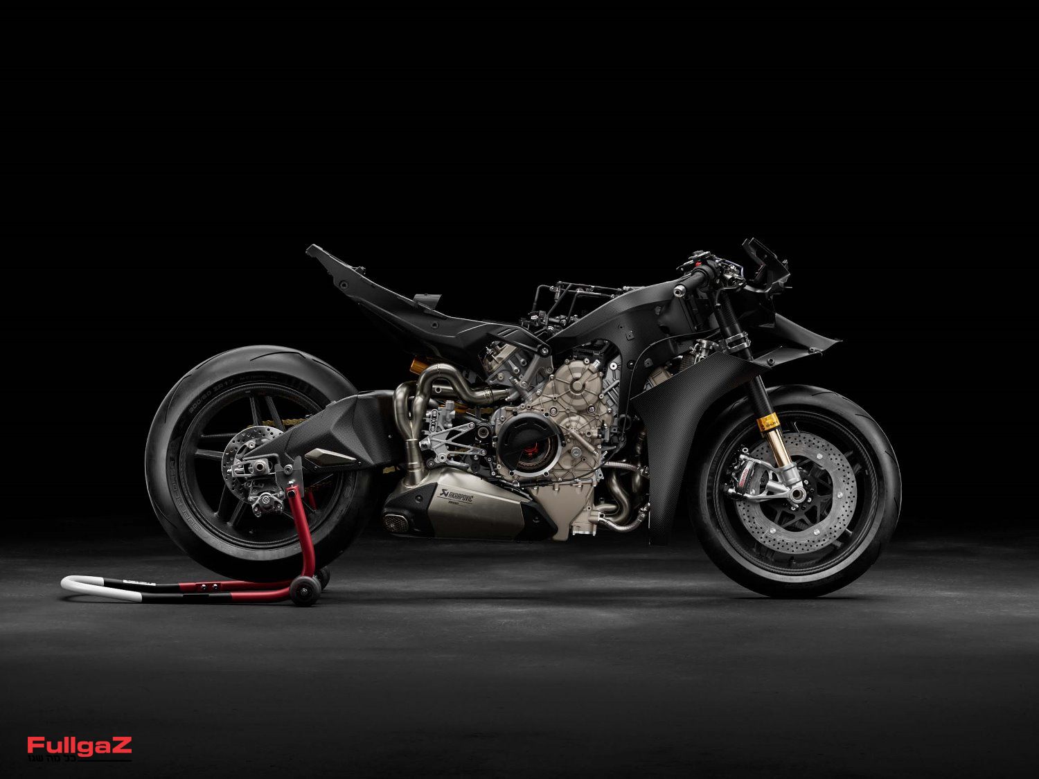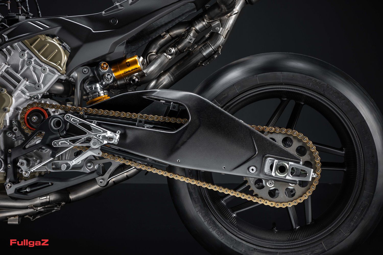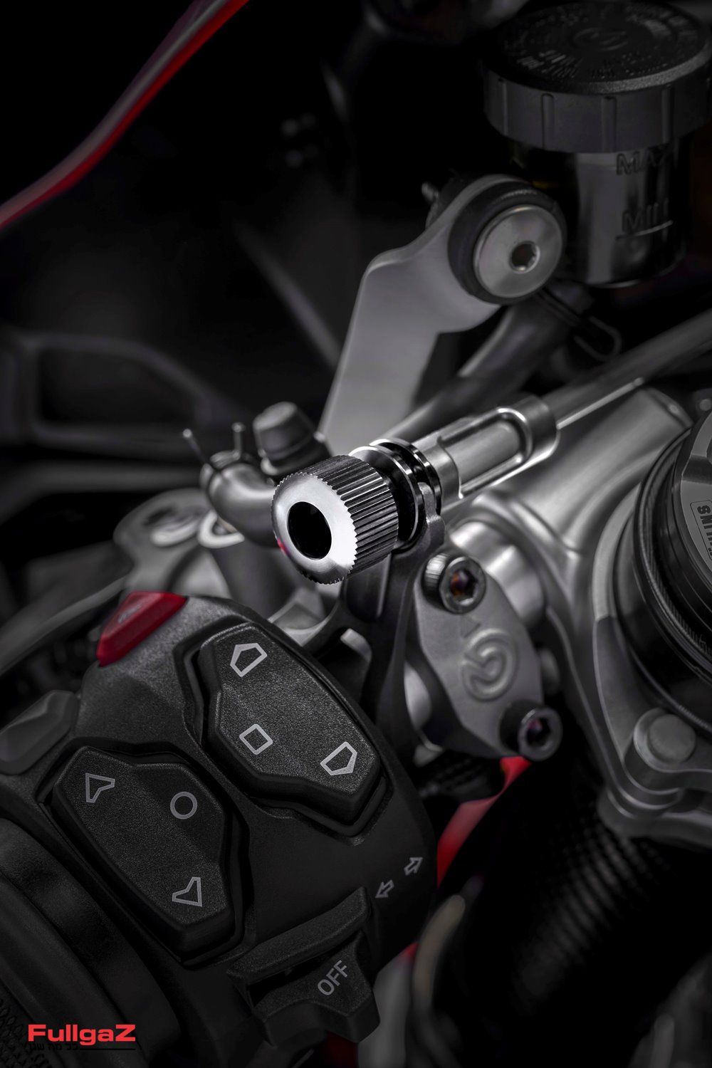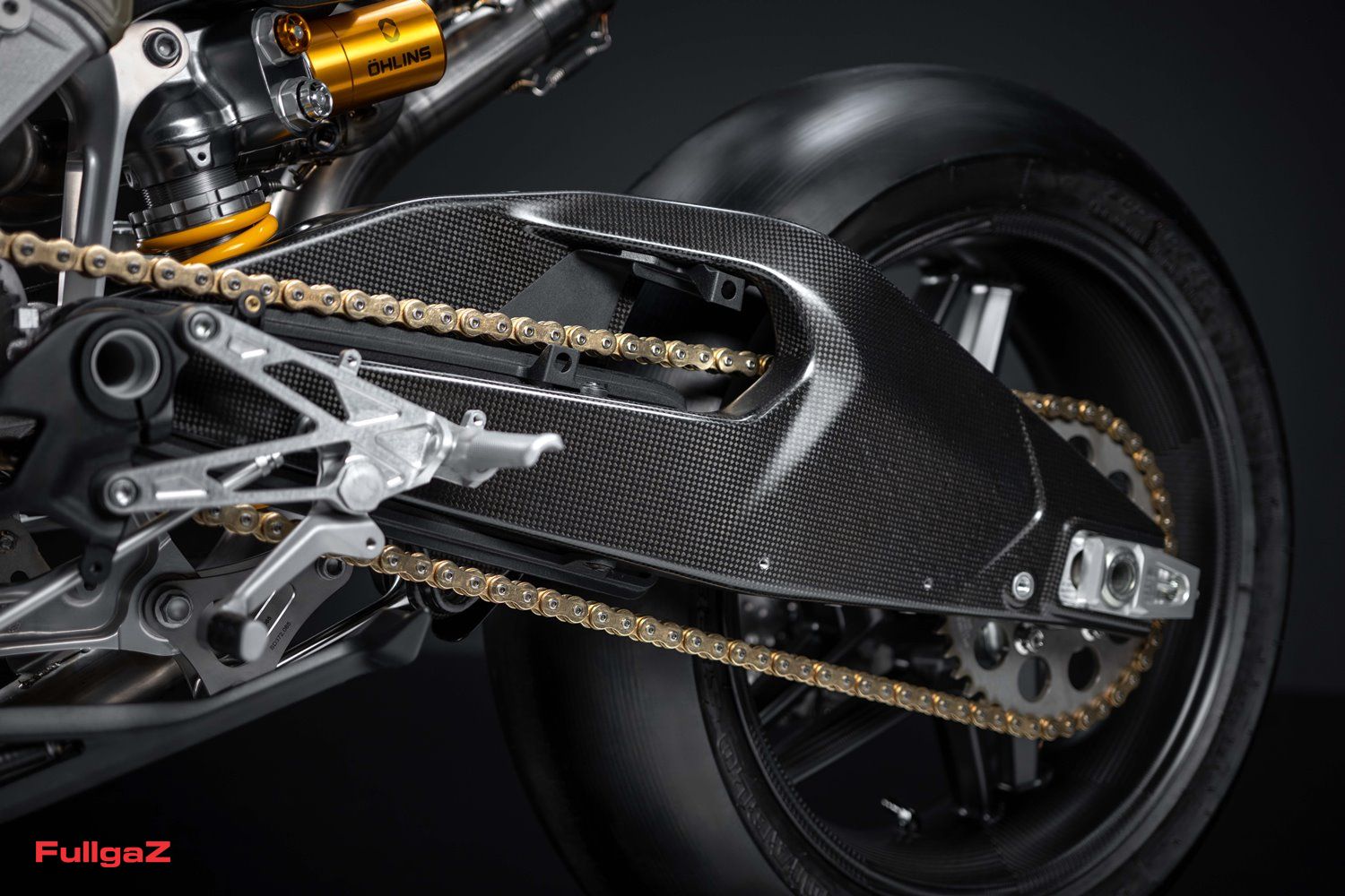בדוקאטי מציינים השנה 100 שנים לחברה בצורה הכי ברורה שאפשר, עם אופנוע־על שלוקח את כל מה שאפשר לחשוב עליו בתחום הדו־גלגלי ומביא אותו היישר אל הסוכנות בתל־אביב עם לוחית רישוי צהובה, מאותתים ומראות. אם הסופרלג'רה (סופר־קל באיטלקית) V4 הקודם היה האופנוע החזק ביותר והטכנולוגי ביותר שיצא ממפעלי דוקאטי שבבורגו פניגאלה (רובע פניגאלה שבבולוניה), אז זה החדש מאפיל עליו. מוטיב השימוש בקרבון שכולל שלדה, זרוע אחורית כפולה מקרבון וחישוקי BST מהחומר האקזוטי וקל המשקל ממשיך כאן, כשלראשונה באופנוע עם רישוי כביש יש גם שימוש במערכת בלמים של ברמבו שכוללת קליפרים מסוג GP4 HY ודיסקים בקוטר 340 מ"מ מקרבון. כן, ממש כמו באופנועי מרוץ.