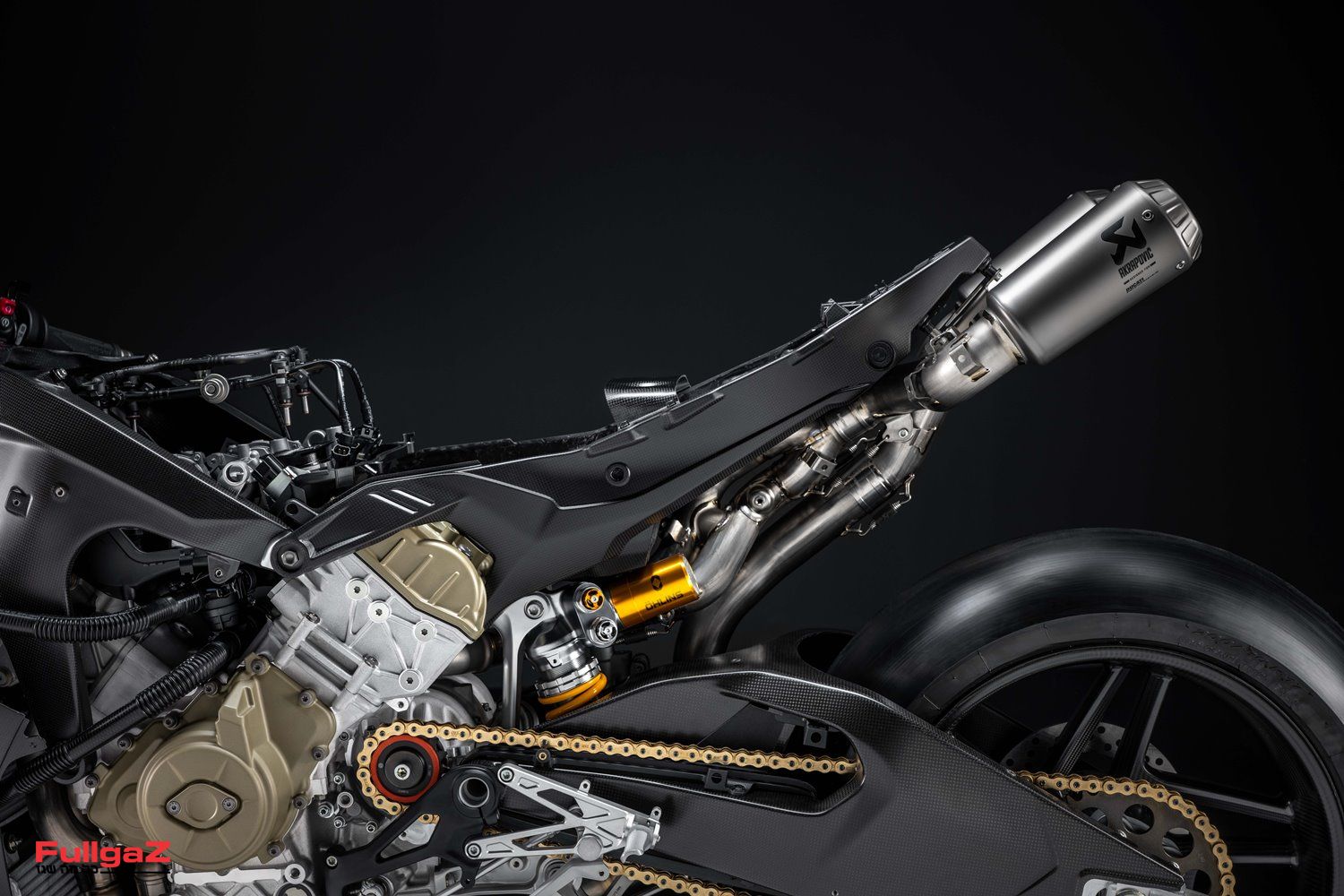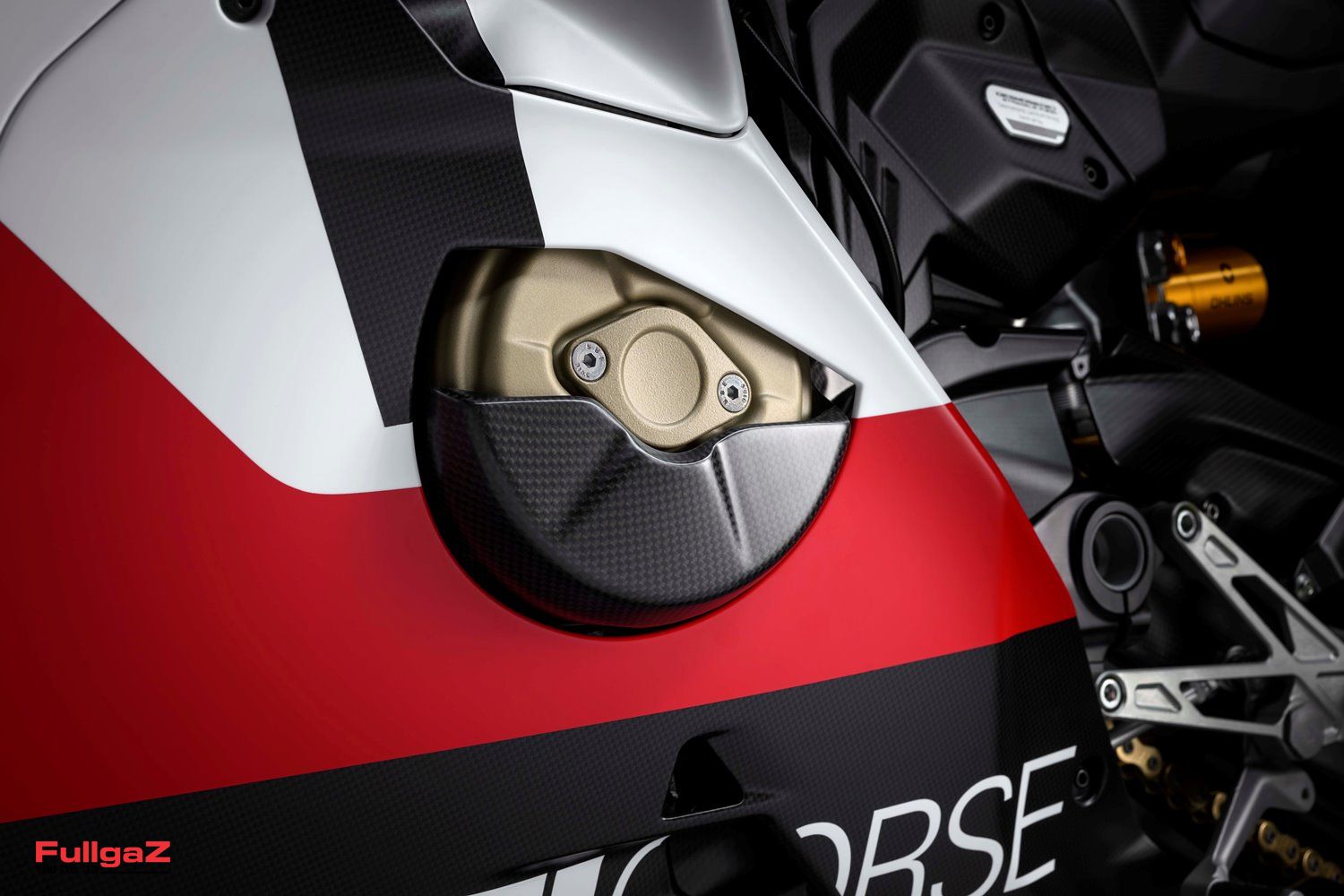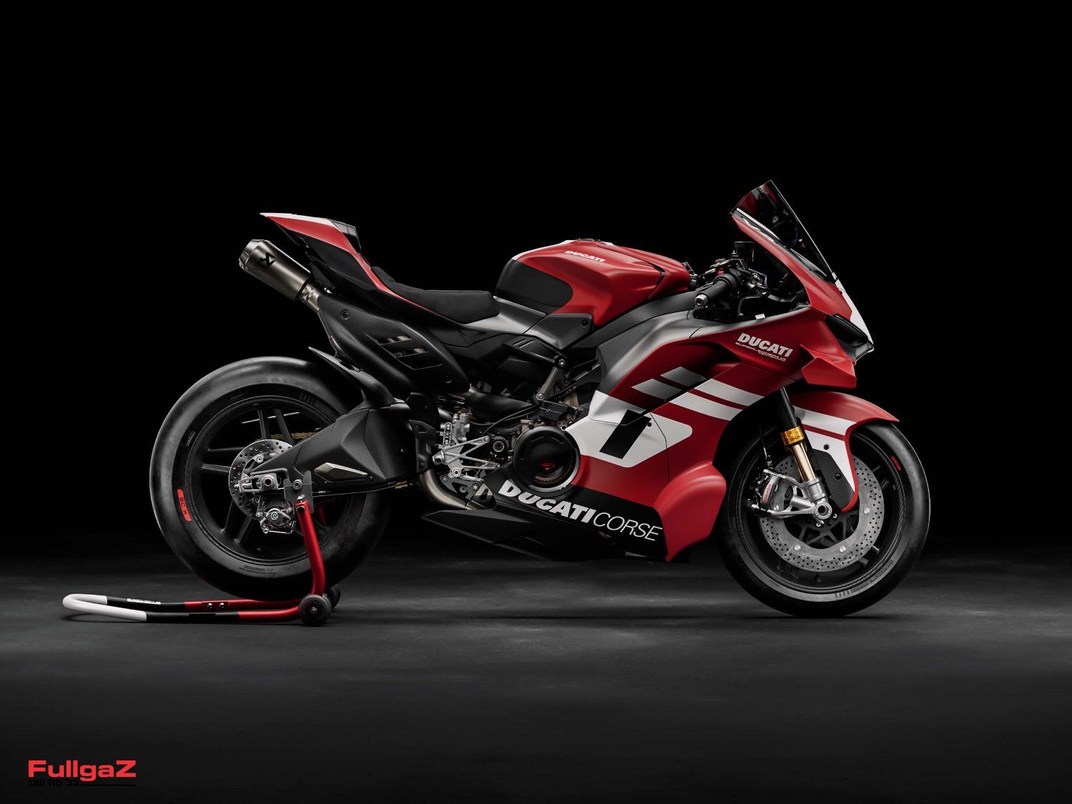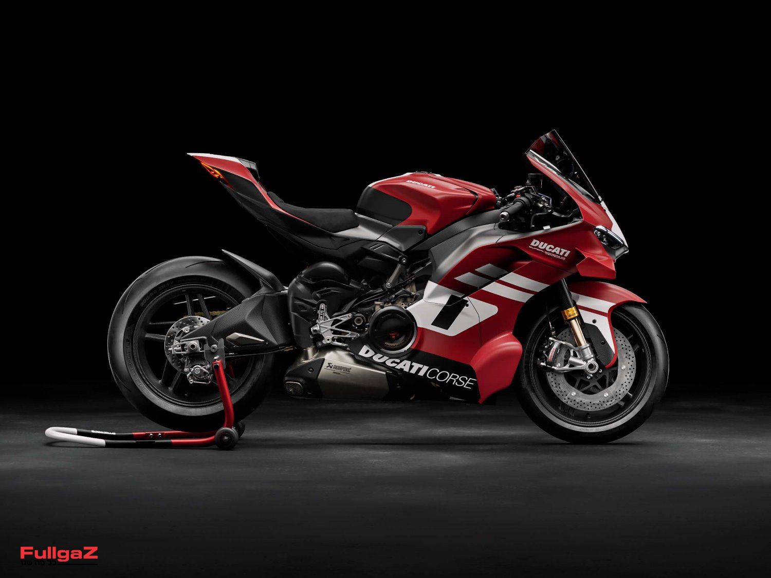 בדוקאטי מציינים השנה 100 שנים לחברה בצורה הכי ברורה שאפשר, עם אופנוע־על שלוקח את כל מה שאפשר לחשוב עליו בתחום הדו־גלגלי ומביא אותו היישר אל הסוכנות בתל־אביב עם לוחית רישוי צהובה, מאותתים ומראות. אם הסופרלג'רה (סופר־קל באיטלקית) V4 הקודם היה האופנוע החזק ביותר והטכנולוגי ביותר שיצא ממפעלי דוקאטי שבבורגו פניגאלה (רובע פניגאלה שבבולוניה), אז זה החדש מאפיל עליו. מוטיב השימוש בקרבון שכולל שלדה, זרוע אחורית כפולה מקרבון וחישוקי BST מהחומר האקזוטי וקל המשקל ממשיך כאן, כשלראשונה באופנוע עם רישוי כביש יש גם שימוש במערכת בלמים של ברמבו שכוללת קליפרים מסוג GP4 HY ודיסקים בקוטר 340 מ"מ מקרבון. כן, ממש כמו באופנועי מרוץ.