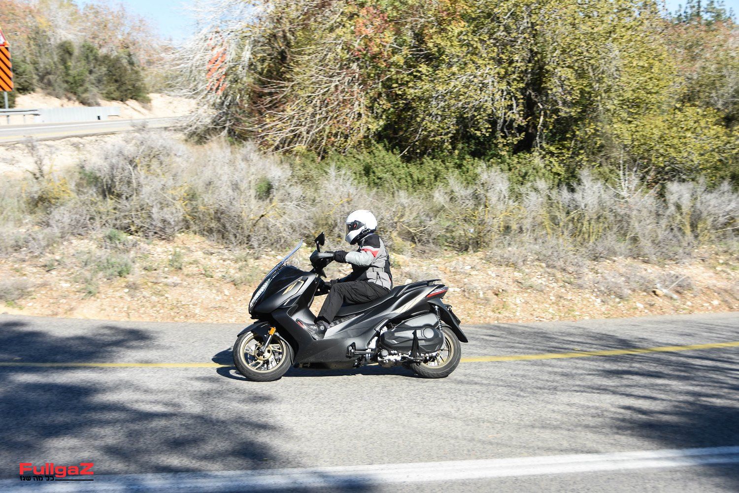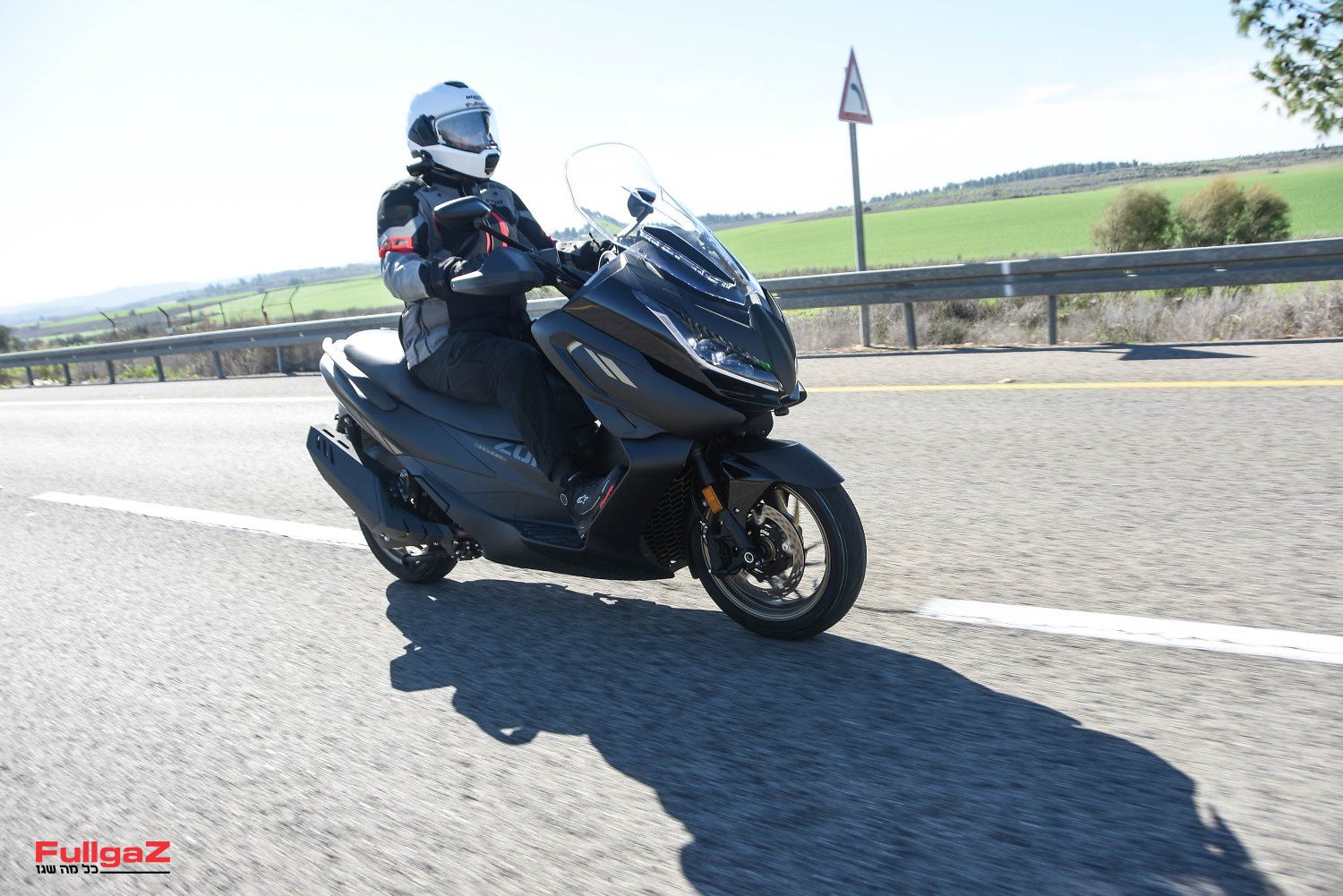 התנהגות הכביש טובה ובטוחה. ההיגוי מעט כבד, כצפוי מקטנוע מנהלים גדול וארוך, אך התחושה הכללית מאוזנת. גם במהירויות גבוהות ובסיבובים מהירים הכלי שומר על יציבות וקור רוח. במעבר על מהמורה בתוך סיבוב מורגש זעזוע ולעיתים נדנוד קל אחד, אך האחיזה לא נפגעת והשלדה לא מאבדת שקט.