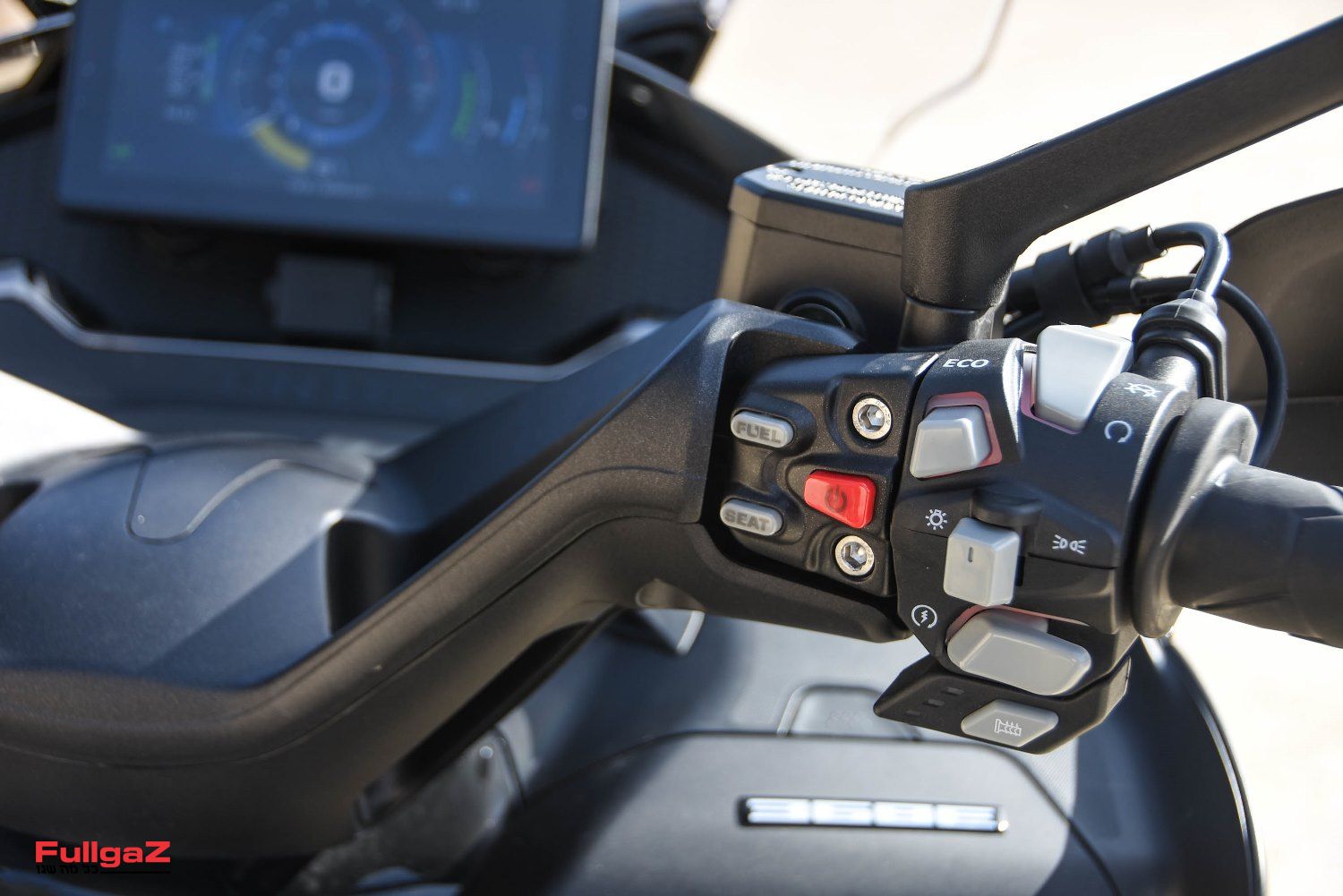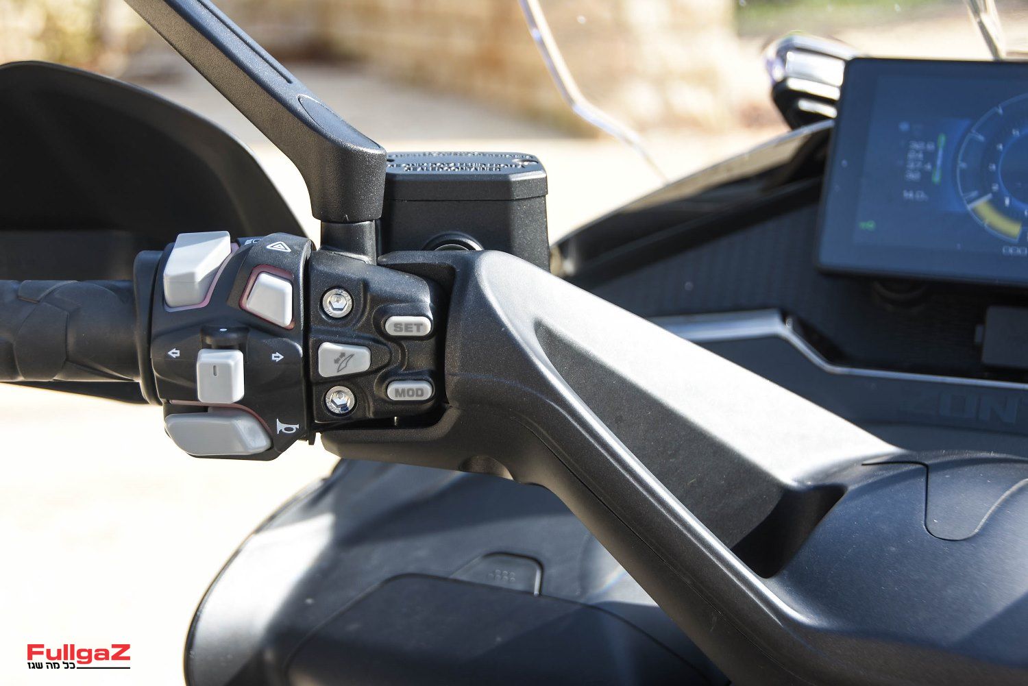 על הכידון מימין נמצא את מתג חימום הידיות עם חמישה מצבי חום ואינדיקציה ברורה למצב הנבחר. הכפתור הזה מן הסתם לא יזכה לשימוש רב בארצנו החמה אך בפעמים בהן הוא יופעל, כמו בימים הקרים בהם בחנו את הקטנוע, הרי שחימום ידיות הוא פינוק מבורך. ולגיבוי יש גם מגיני ידיים שחוסמים את הרוח מידי הרוכב.