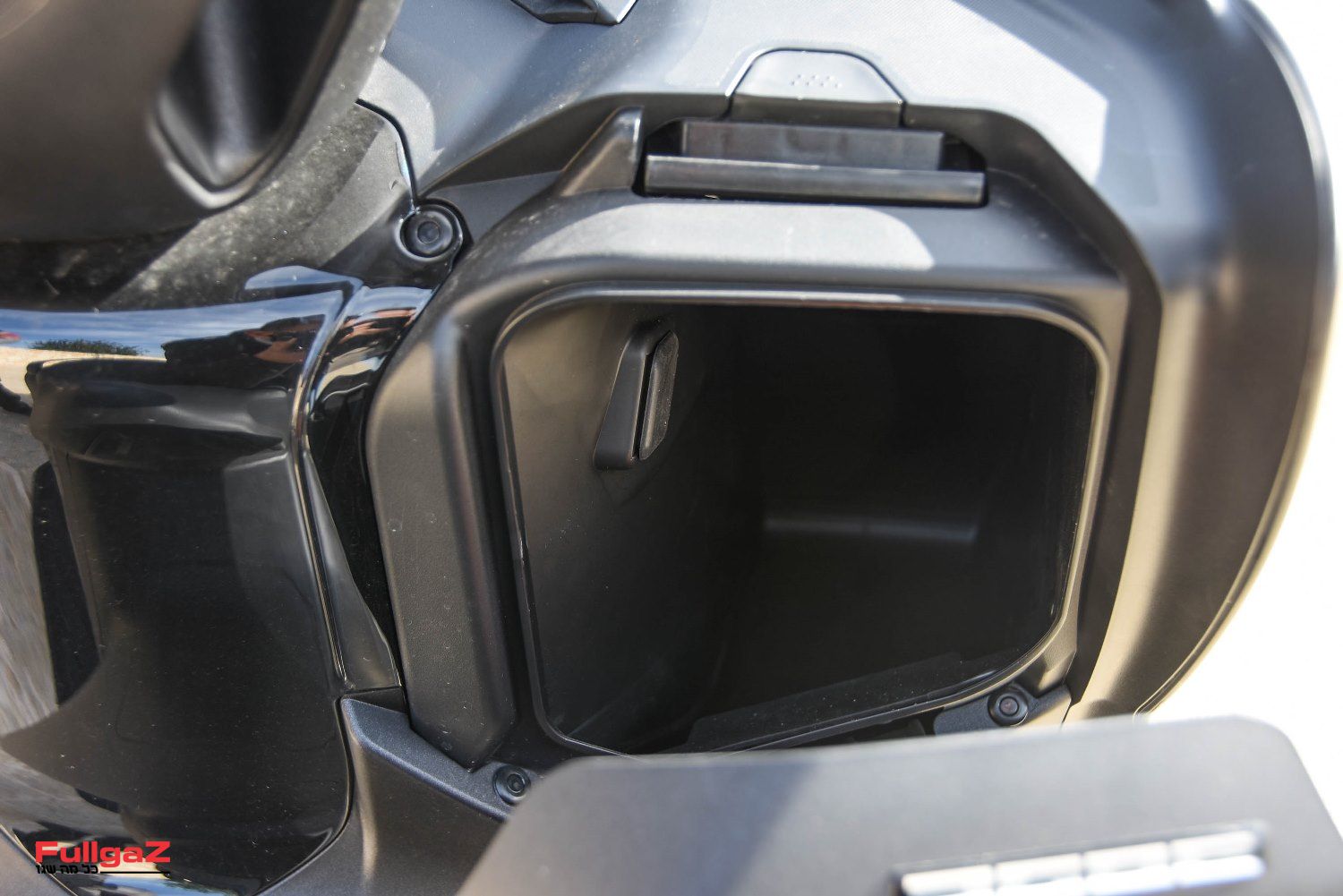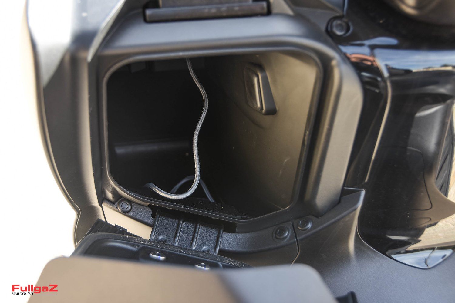 שני תאי הכפפות עמוקים ויכילו כל טלפון או אפילו בקבוק שתייה ללא בעיה. תא המטען שמתחת למושב לא נראה גדול בתחילה אך זו הפעם הראשונה בה הצלחנו לאפסן את הקסדה הנפתחת ללא צורך בפירוק המצלמה – מרשים! במרכז התא יש חוצץ פלסטיק שמפריד בין החלק הקדמי לאחורי וניתן לשליפה בקלות. רגליות המורכב נפתחות בלחיצה קלה ויש למורכב גם ידיות אחיזה נוחות.