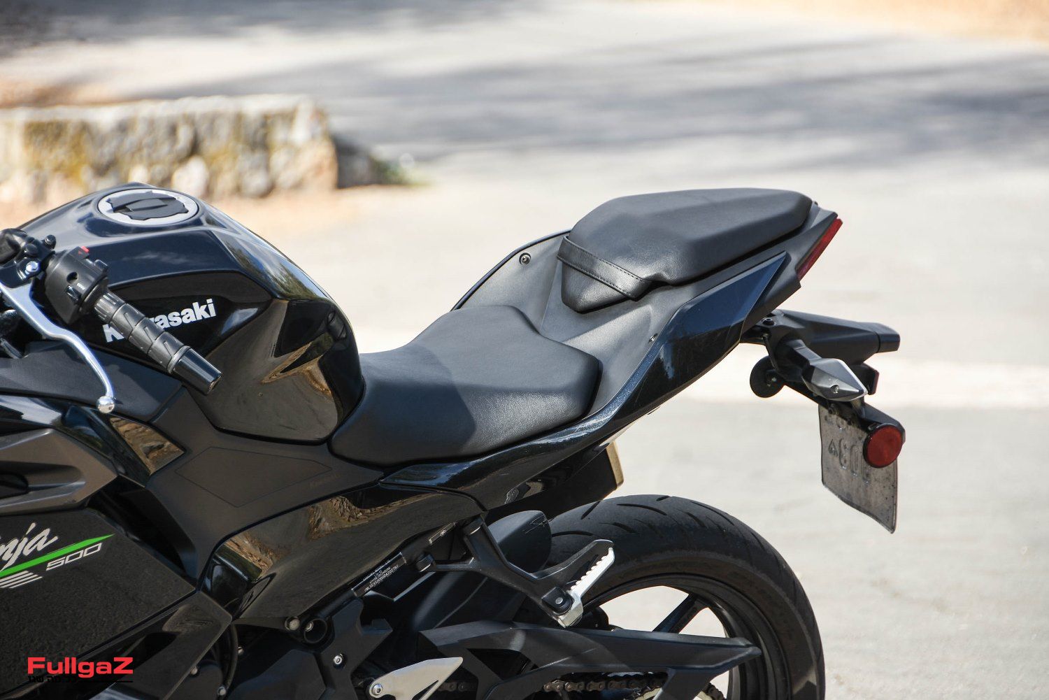 הנינג'ה 500 הוא אופנוע קטן יחסית, וזה הגיוני, שכן הוא אבולוציה של אופנועי 250 ו־300 סמ"ק. תנוחת הרכיבה מציבה את הרוכב זקוף ביחס לאופנועי ספורט טהורים, עם קליפ־אונים שממוקמים מעל למשולש העליון כמקובל בקטגוריה, והתנוחה הזו מאפשרת שליטה טובה. יחד עם זאת, הקליפ־אונים קצת צרים, והיינו מעדיפים אותם רחבים יותר או את הכידון השטוח של ה־Z, אחיו לפלטפורמה. אזור מיכל הדלק צר מאוד, ובכלל הממדים הקטנים של האופנוע גורמים באופן ישיר למשקל הנמוך ותורמים לשליטה הקלה באופנוע. אי אפשר לומר שהיה צפוף עליו, אבל הוא לא מרווח, וייתכן שרוכבים גבוהים ירגישו צפיפות מה.